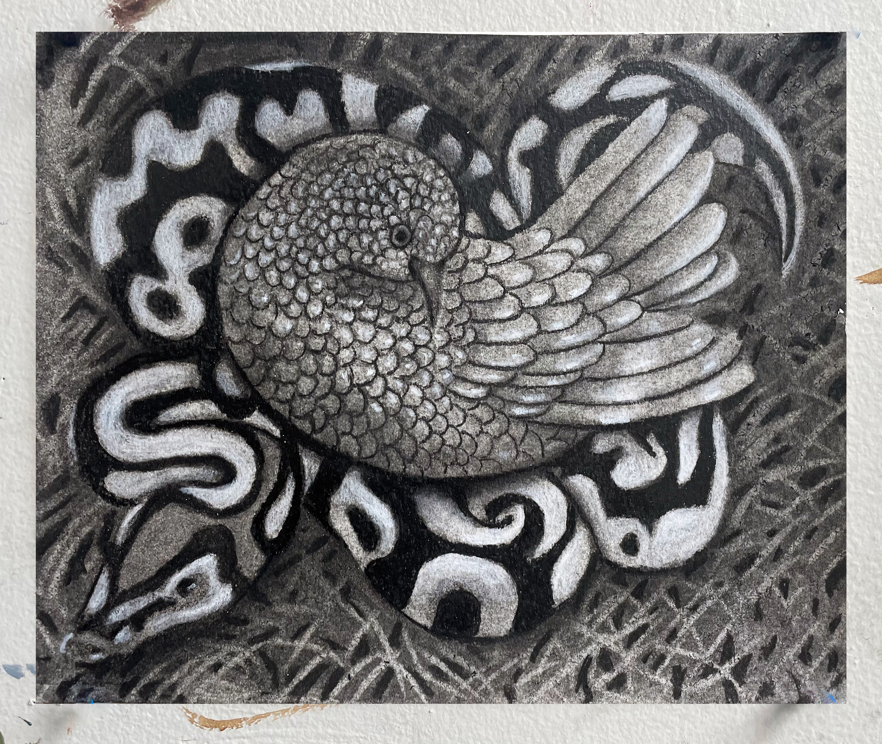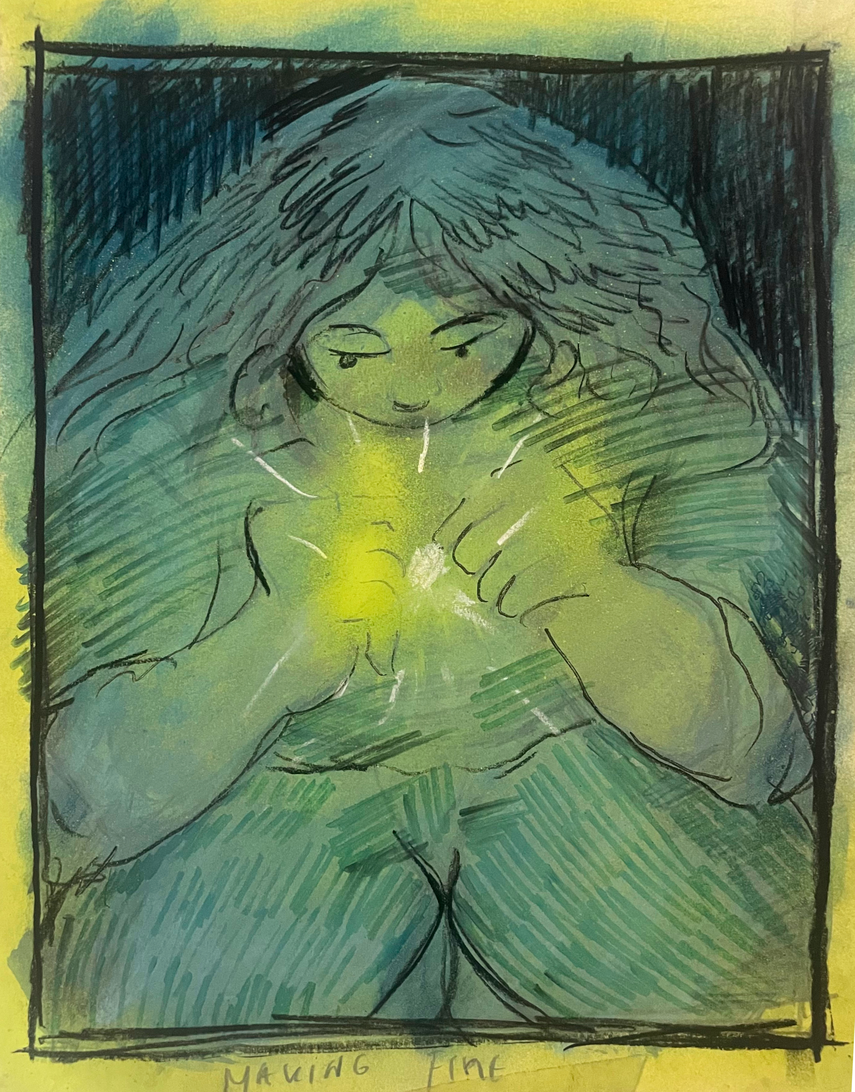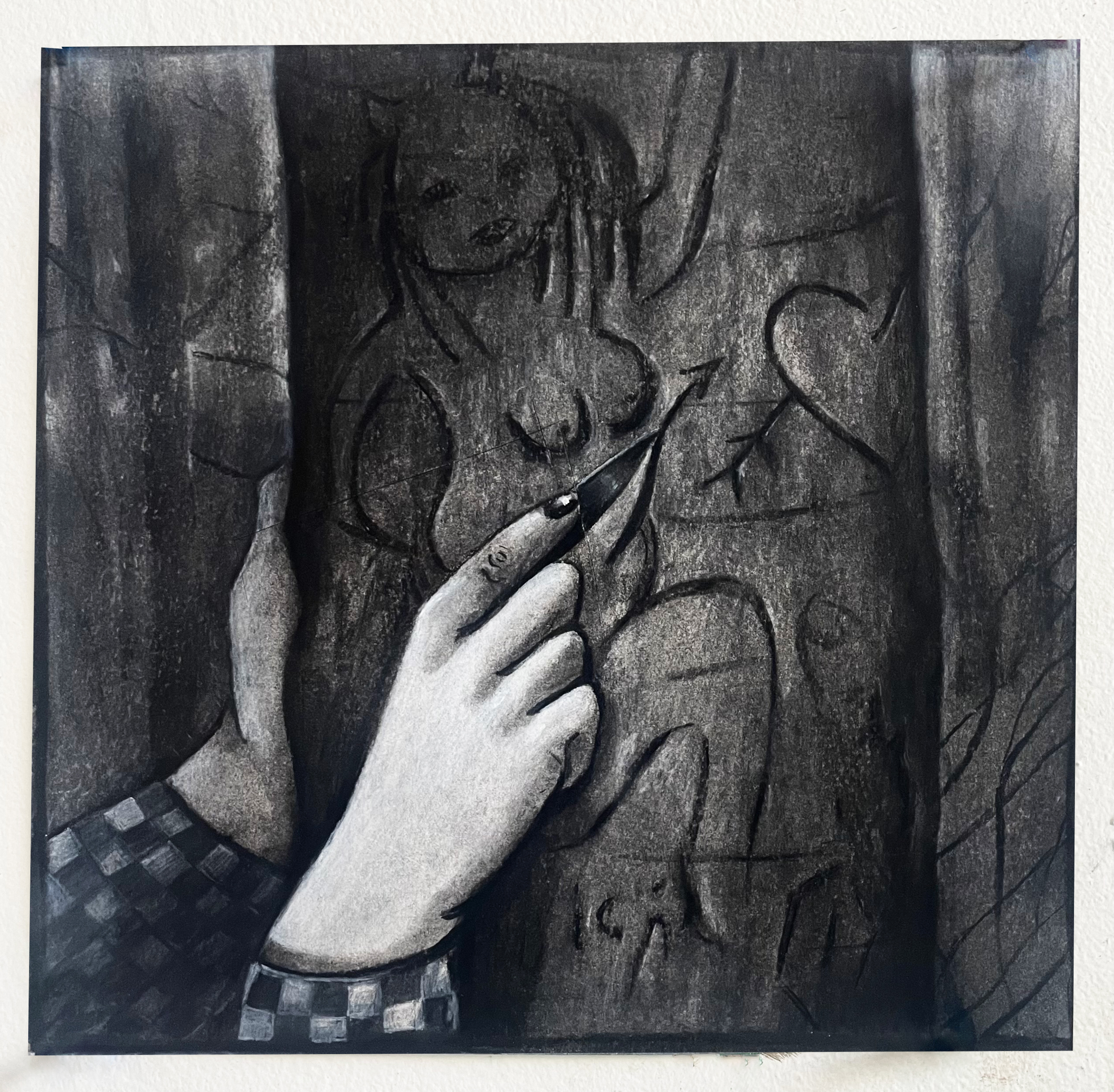 Making Fire, Spray paint, pen, pastel and charcoal on paper 2023