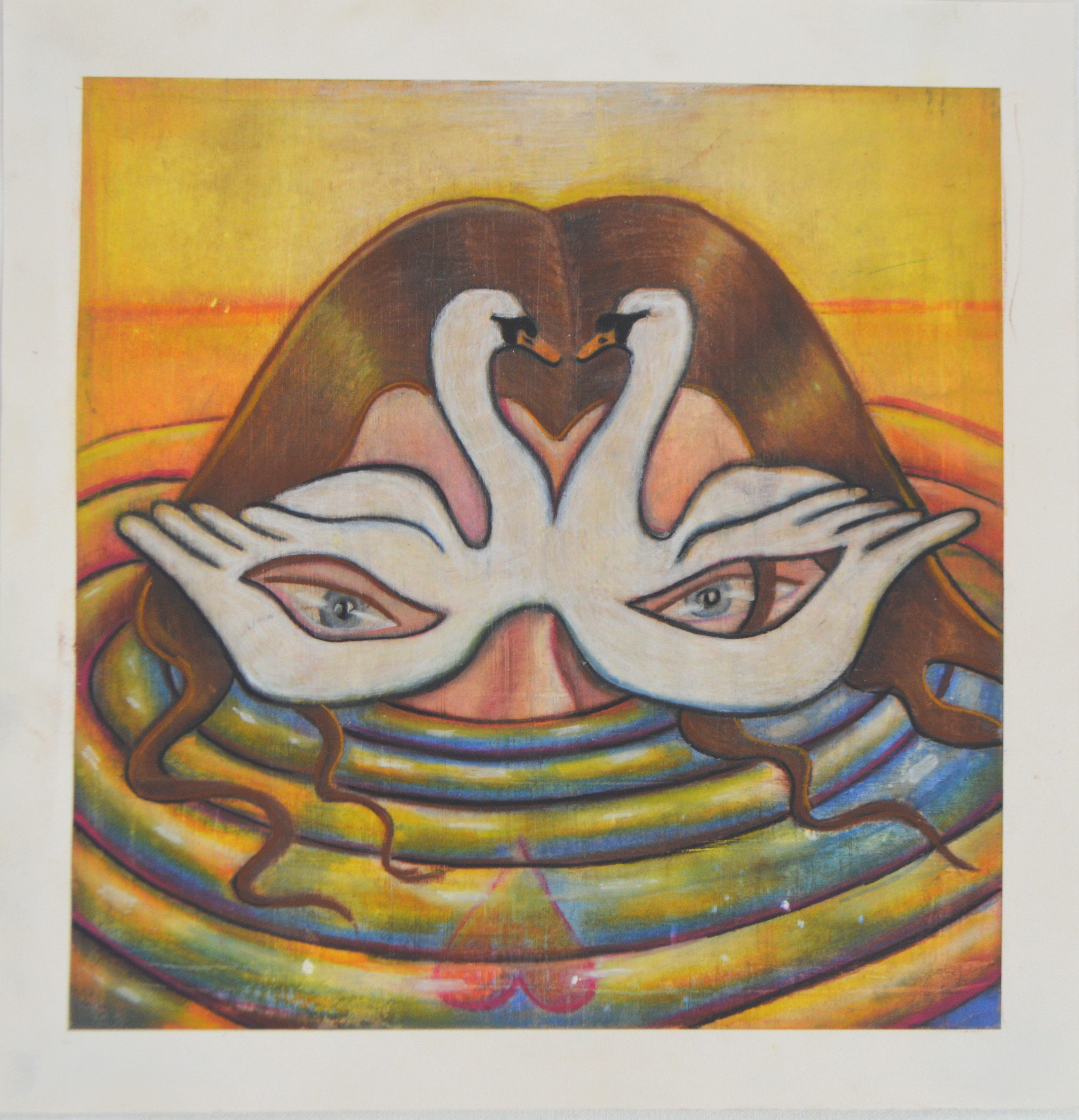 Swan Lake drawing, pastel pencil on paper, 7"x10"
